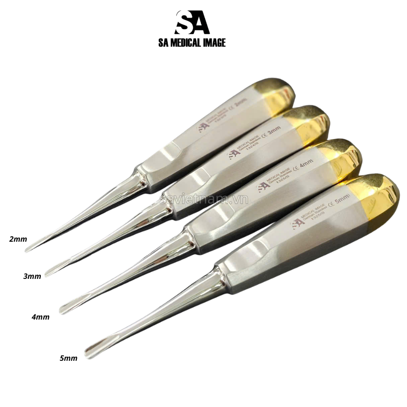 Sản phẩm: BẨY THẲNG CÁN VÀNG SA MEDICAL (thép Đức) Hãng sản xuất: SA Medical image Xuất xứ: Parkistan Chất liệu: 100% thép Đức Bẩy có 4 kích thước bẩy: 2mm, 3mm, 4mm, 5mm